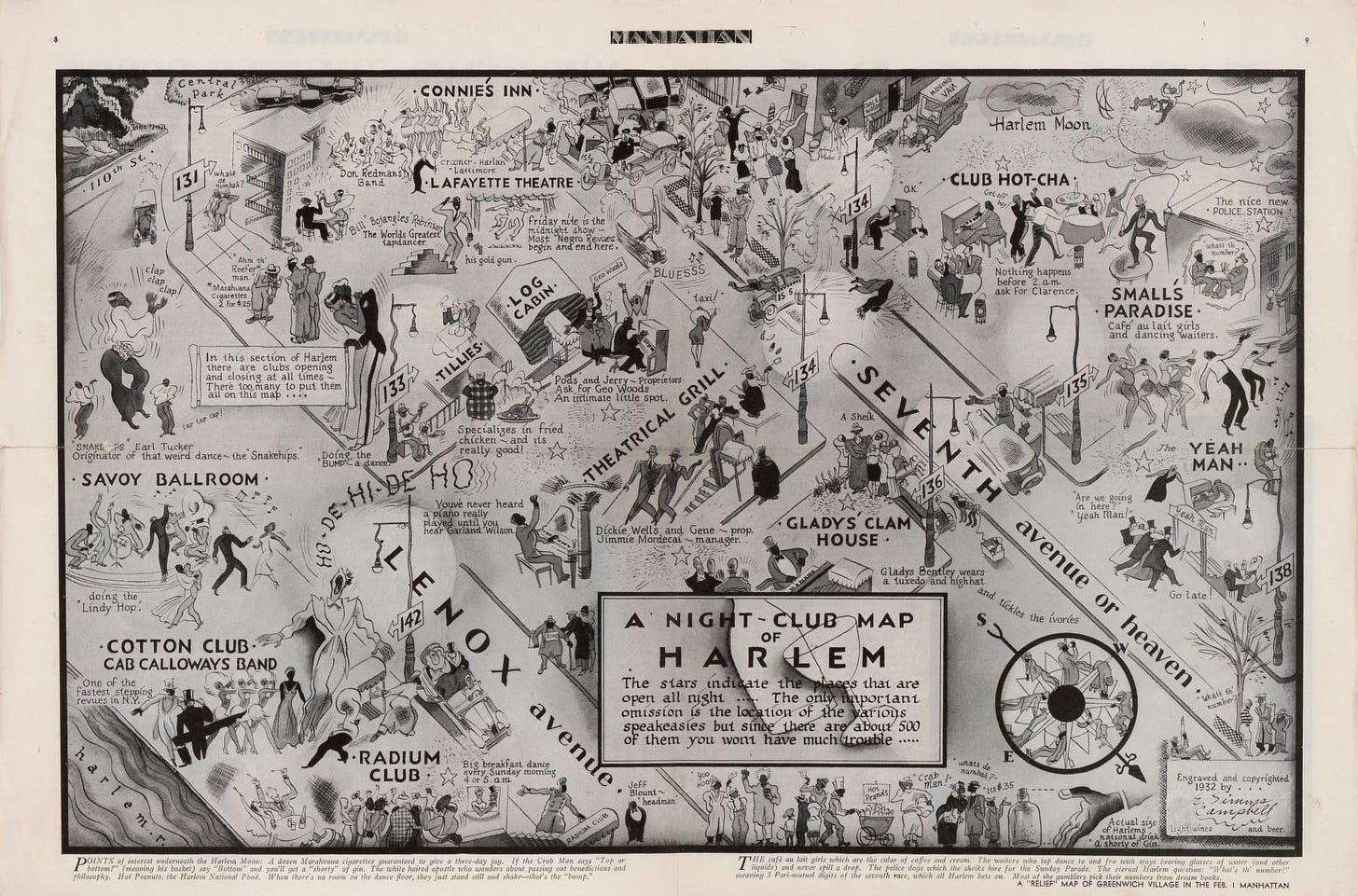 On a recent visit to the Norman Rockwell Museum in Stockbridge, Massachusetts, we took in a terrific exhibit, Jazz Age Illustration, which recounts the transformative nature of popular illustration and graphic design between 1919 and 1942. One of the pieces in the exhibit was “A Nightclub Map of Harlem” (1933) by pioneering black illustrator E. Simms Campbell, which depicts the popular nightclubs and speakeasies of the Harlem Renaissance, dotted with the colorful characters making up the rich, vibrant neighborhood at a time of artistic revolution. The illustration is full of fascinating little details and historical/cultural insights, particularly in depicting which jazz establishments are frequented by white patrons: if you peep the famous jazz nightclub the Cotton Club in the bottom left corner, you’ll notice the two rich white visitors arriving by town car, escorted into the establishment by a black doorman.