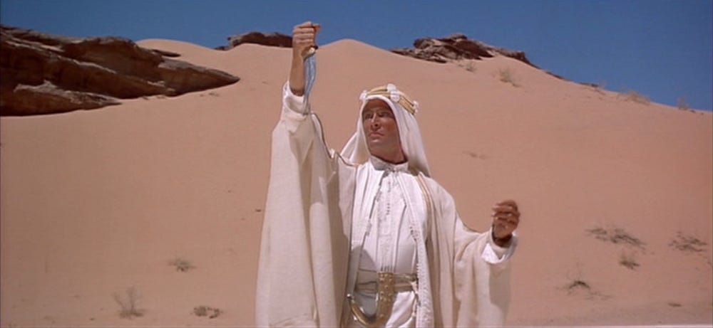 We watched The Last Samurai for the first time over the Thanksgiving weekend alongside another Zwick classic, beloved “male weepie” Legends of the Fall (1994), in which a patriarch and his three sons disavow the U.S. military over its treatment of Native Americans and move to a vast swath of land with their Cree friend; son Brad Pitt, who is trained by the Cree in the ways of hunting and living off the land, cannot ever truly fit within white society given his wild, untamable spirit. With Zwick,5 we began to notice a definite pattern: a white male protagonist, imperfectly aligned with the white imperial order, seeks out a place within another culture, earning a way in through mutual respect and adherence to a real (and imagined) code of honor, fighting alongside his newfound people. This is an enduring masculine fantasy: from the “going Native” trope so popular in western and historical fiction narratives—a man is kidnapped by or seeks out a Native tribe/primitive civilization, learning their ways and abandoning white society—to the white-centered “fish out of water” stories, like Lawrence of Arabia (1962), The Yakuza (1974), Mr. Baseball (1992), and Seven Years in Tibet (1994), to the White Guy Orders in Perfect Chinese, Shocks Patrons and Staff meme of the 2020s. It seems only more relevant as the corny, evil white men in Washington boldly embrace a politics of xenophobia, white supremacy, misogyny, and general inelegance, which has, to hear the internet tell it, reinvigorated the cultural cachet of “wokeness.”